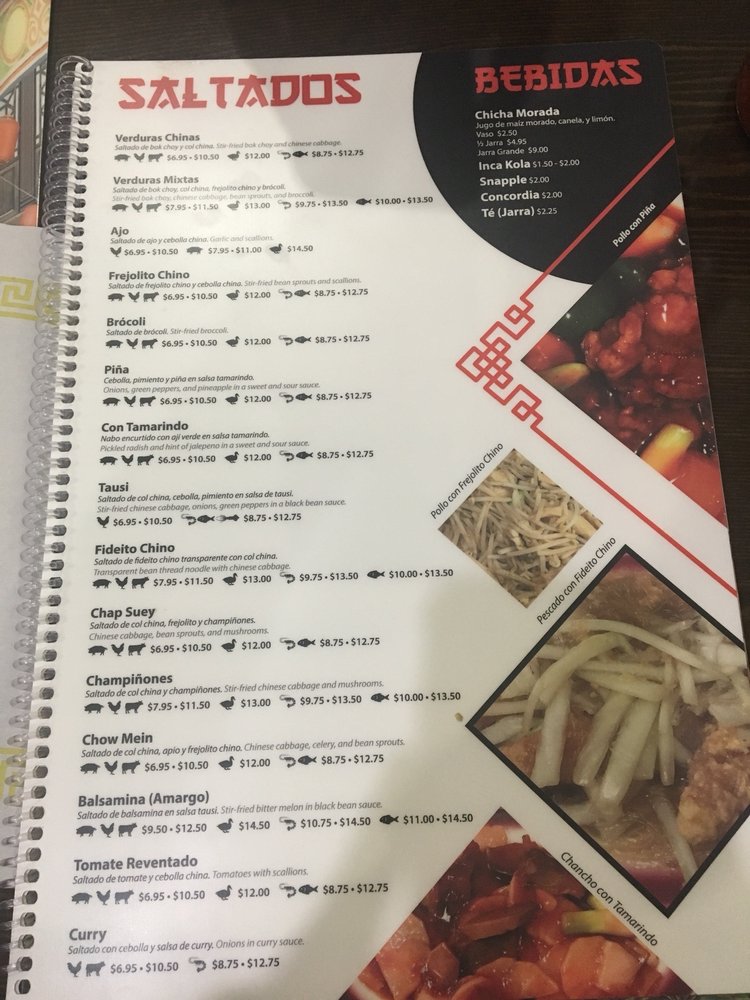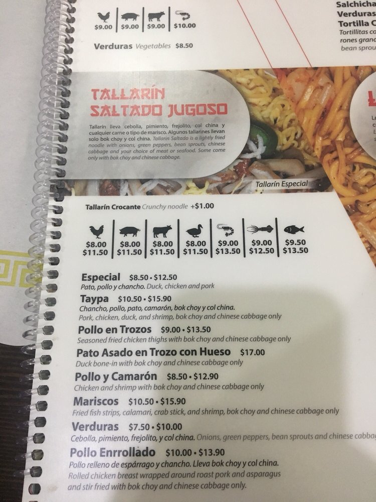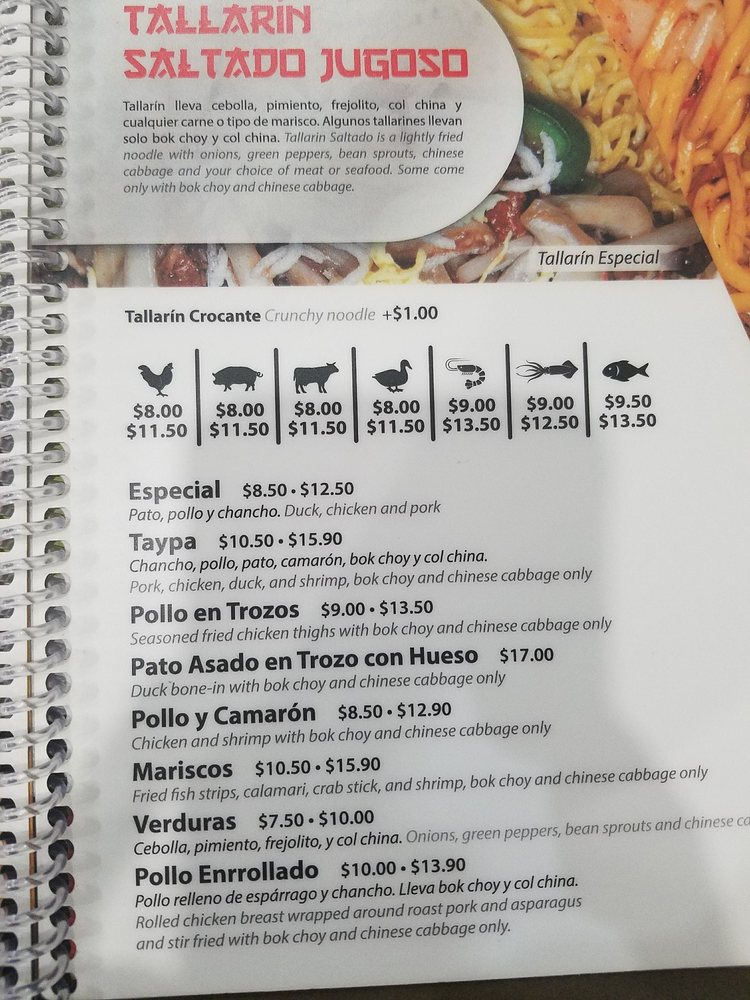 Tallarin lleva cebolla, pimiento, frejolito, col china y cualquier care o tipo de marisco. Algunos tallarines llevan solo bok choy y col china. Tallarin saltado is a lightly fried noodle with onions, green peppers, bean sprouts, chinese cabbage and your choice of meat or seafood. Some come only with bok choy and chinese cabbage