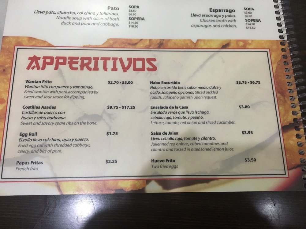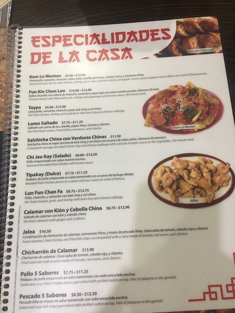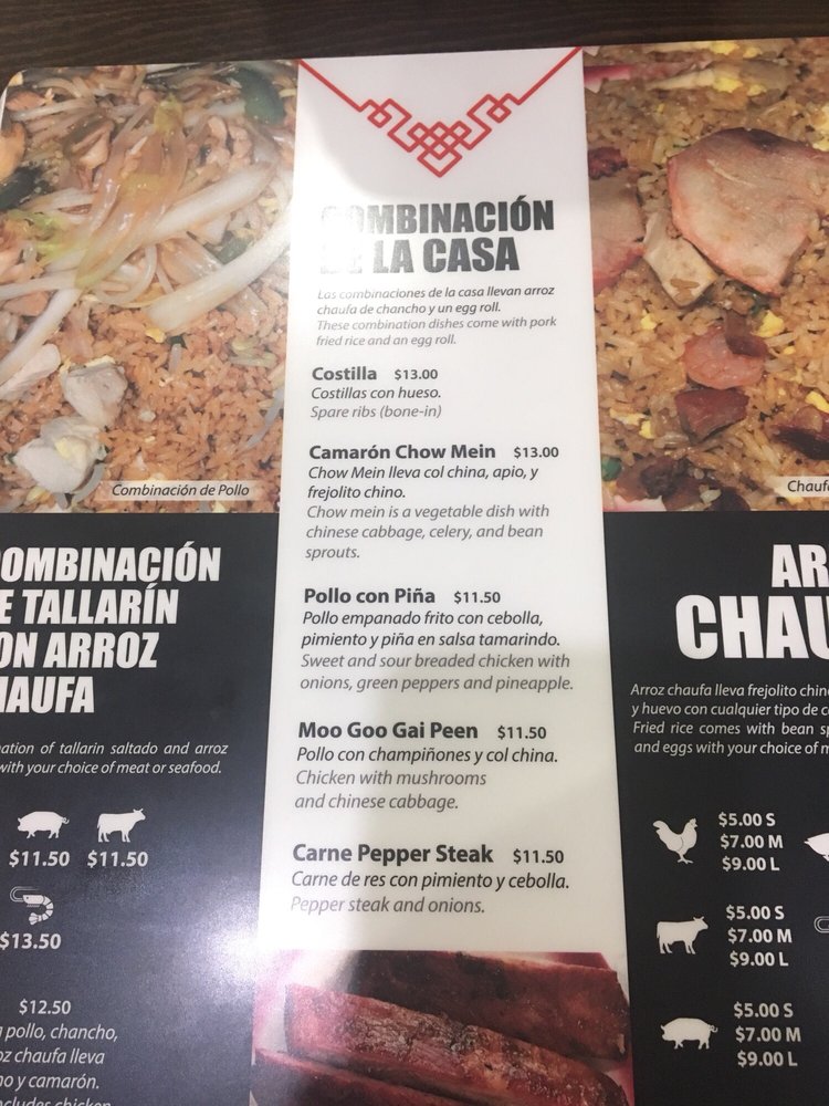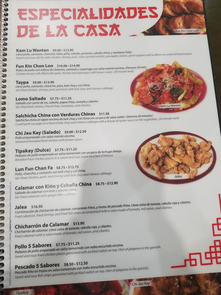 Lleva pollo, camaron, chancho, nabo, pina, cebolla, pimiento, cebolla china , y wantanes fritos . Sweet and sour stir fry with chicken, shrimp, pork, nabo ( pickled radish ) , pineapple, onions , green peppers and scallions on a bed of fried wonton.